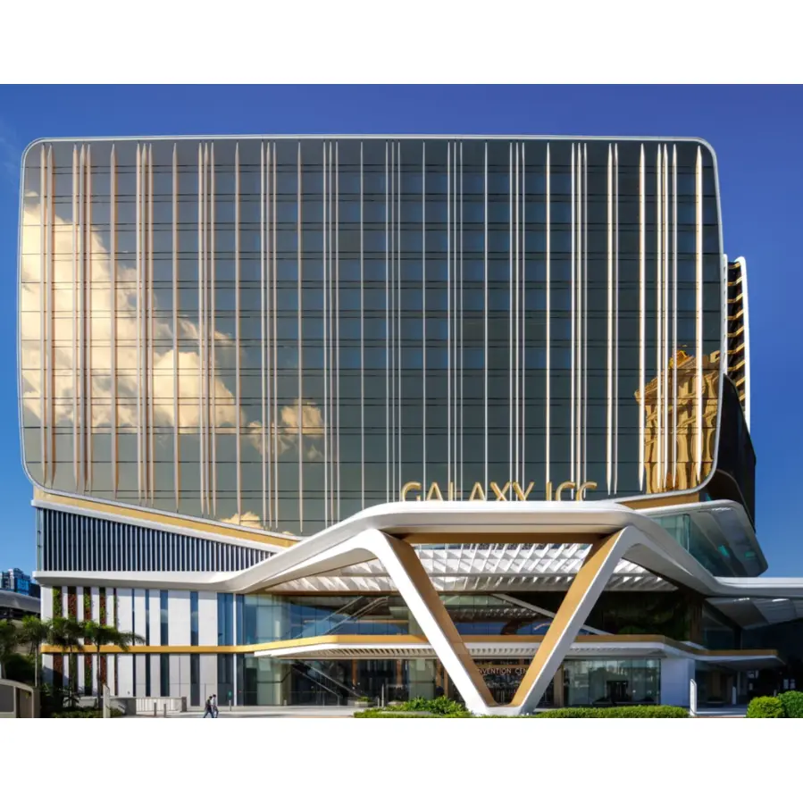Panel Tunggal Aluminium Berbentuk Tidak Beraturan mendukung pemrosesan permukaan lengkung yang kompleks, termasuk permukaan lengkung tunggal dan lengkung ganda, memungkinkan terciptanya fasad bangunan yang mencolok secara visual. Mereka juga dapat disesuaikan untuk dinding tirai interior yang bentuknya tidak beraturan, beradaptasi dengan lobi langit-langit tinggi, desain atrium, ruang lift, dan ruang interior lainnya, menyeimbangkan fungsionalitas arsitektur dengan desain estetika dan mendobrak batasan dinding tirai planar tradisional.